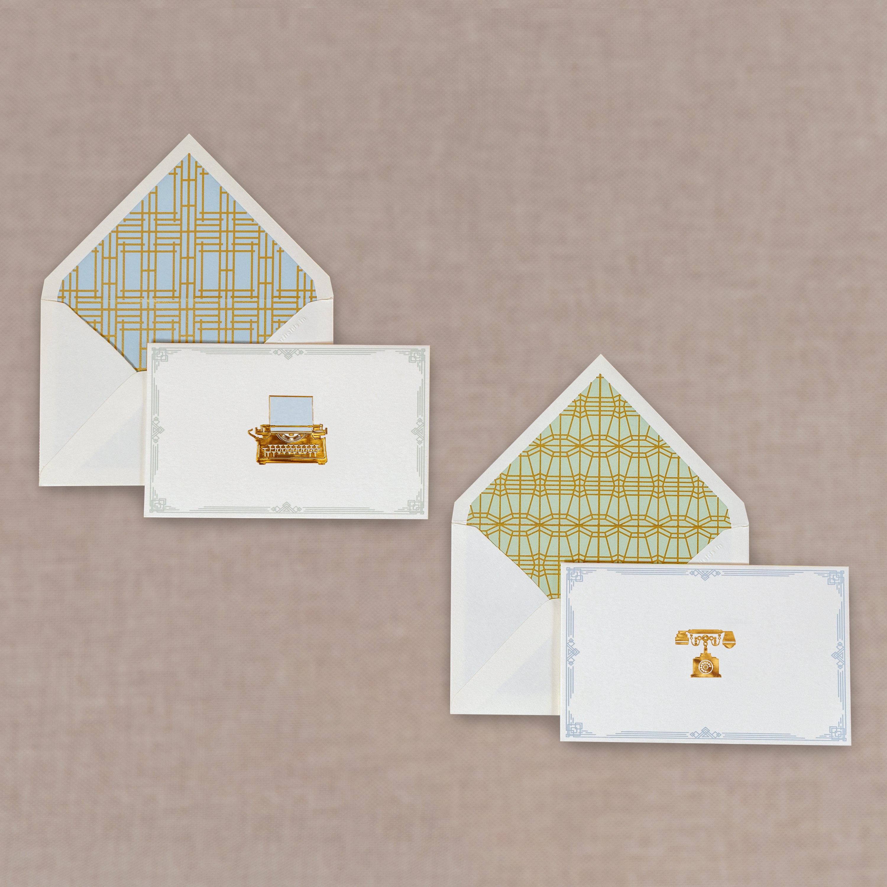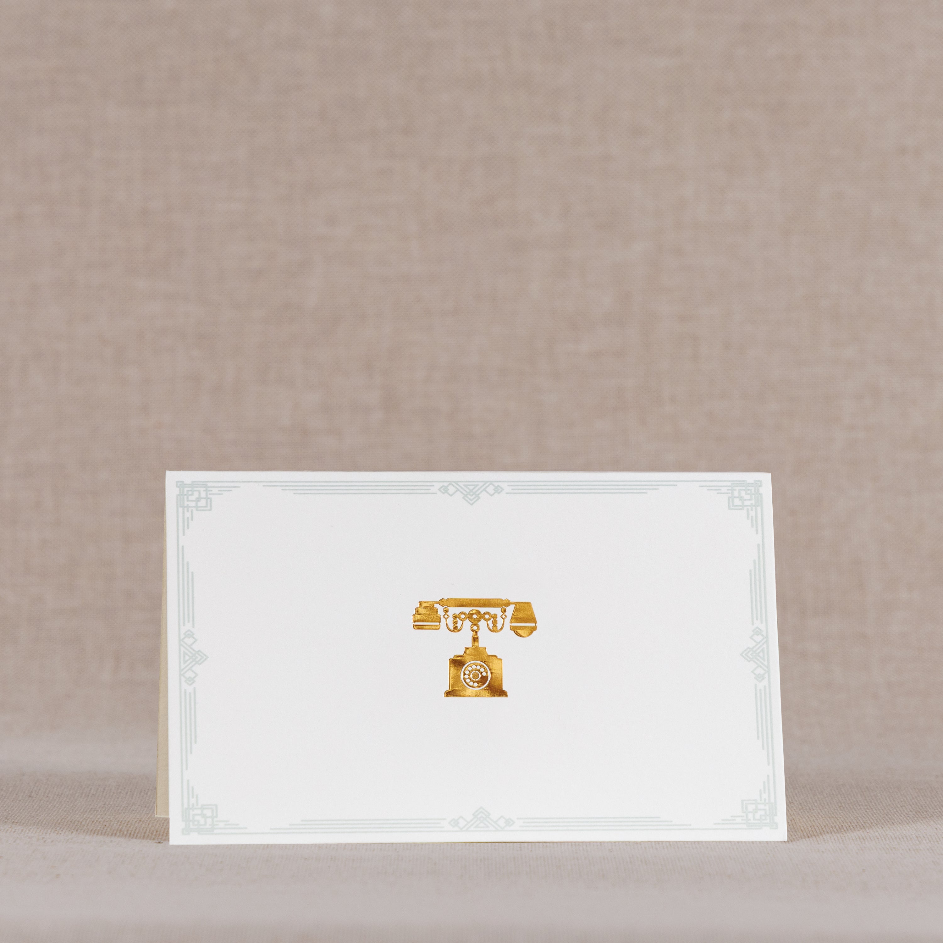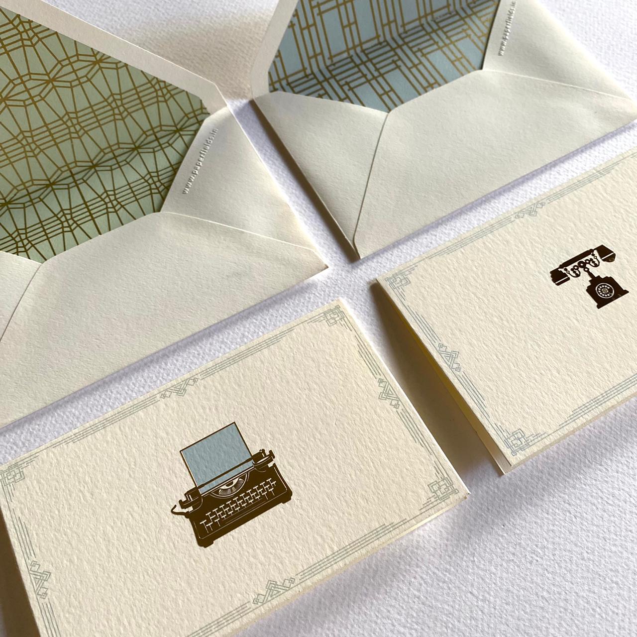 As our old friends, the typewriter and the telephone, once ubiquitous in their era, took the curtain call a few years ago, we devote this stationery set to these beautiful instruments of human expression. They are an important liaison to our present world of articulation, and we venerate them by depicting their intricate beauty in gold. They transport us back into a slow dreamy era, into a time of slow living.