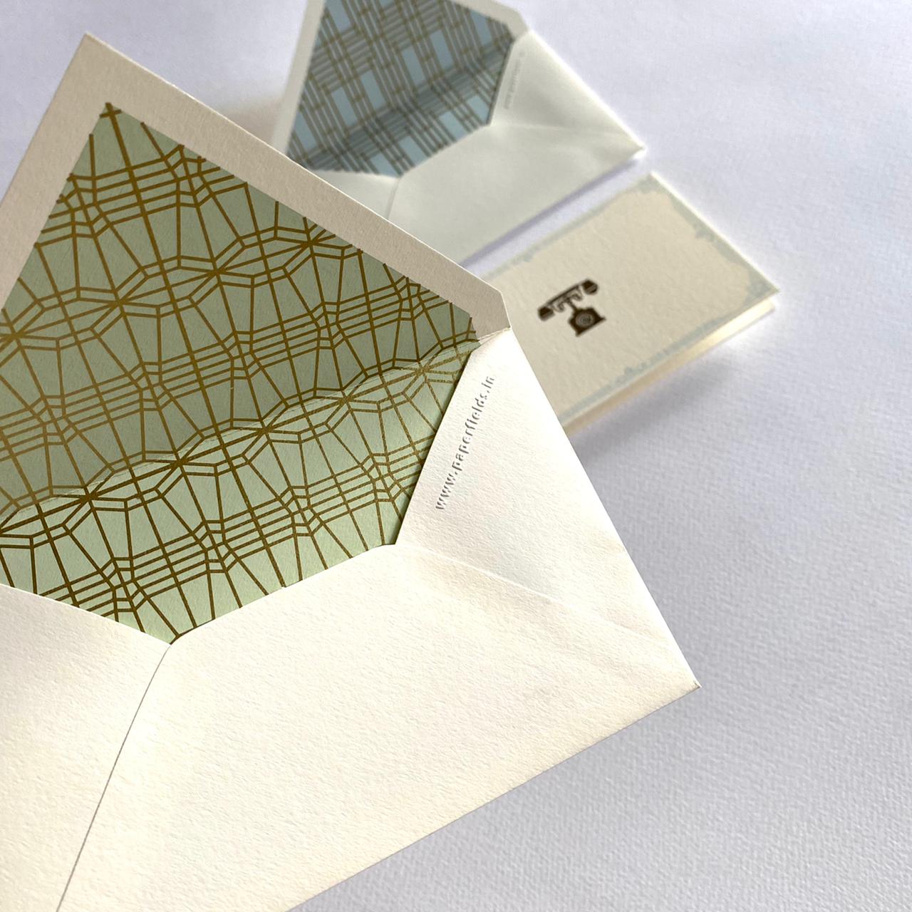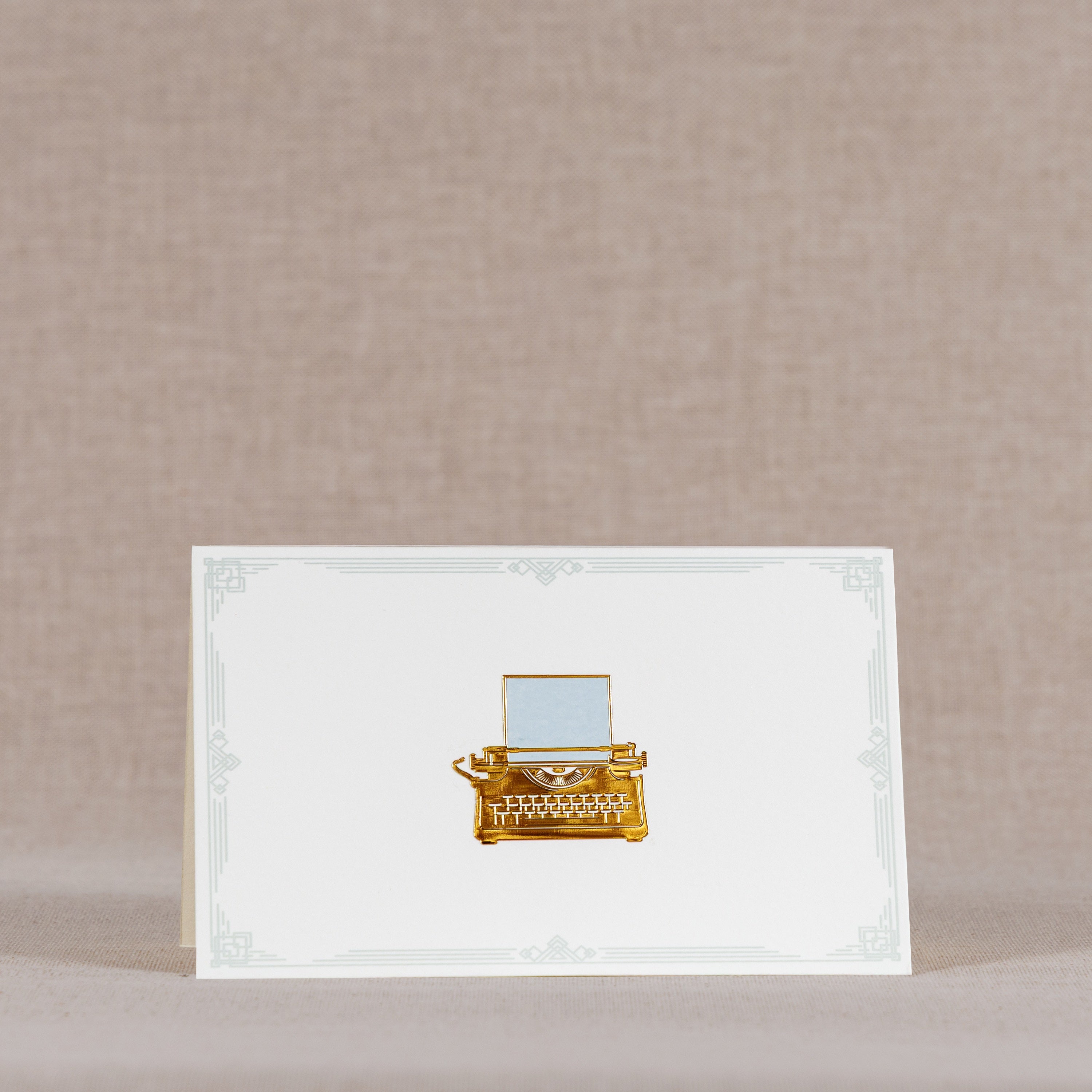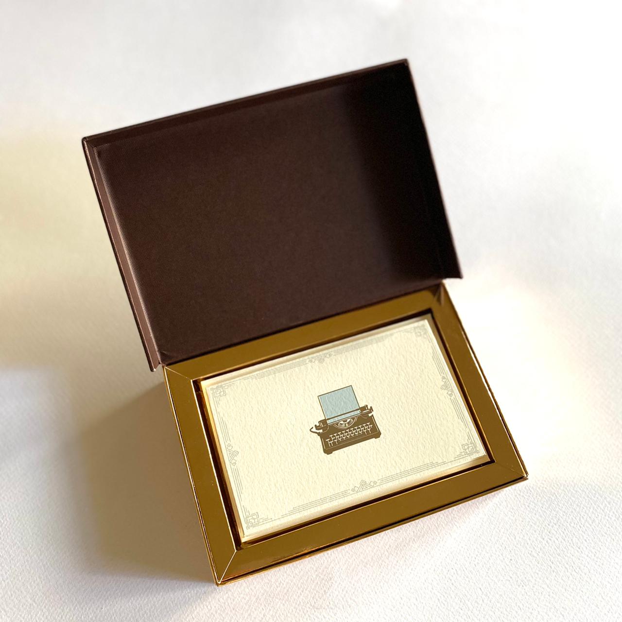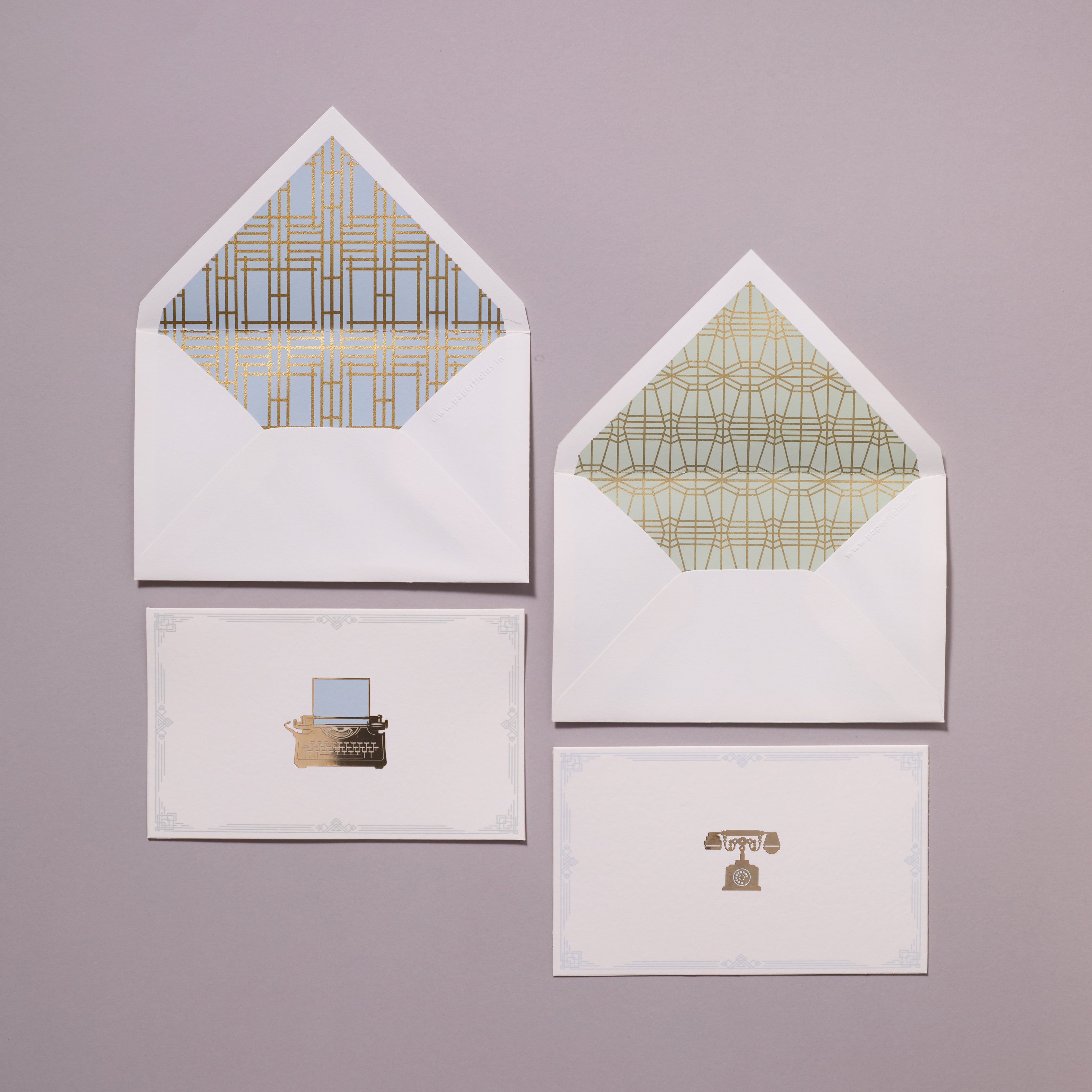 As our old friends, the typewriter and the telephone, once ubiquitous in their era, took the curtain call a few years ago, we devote this stationery set to these beautiful instruments of human expression. They are an important liaison to our present world of articulation, and we venerate them by depicting their intricate beauty in gold. They transport us back into a slow dreamy era, into a time of slow living.